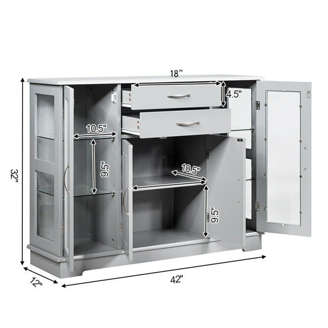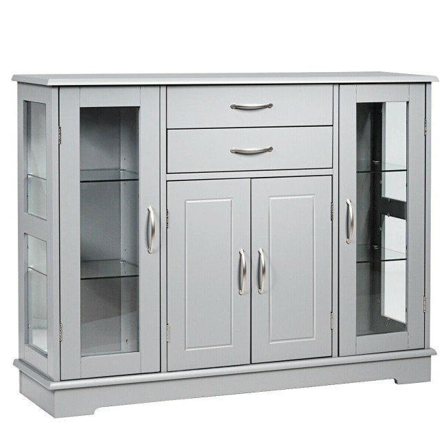 This Grey Wood 3 Tier Buffet Sideboard Cabinet with Glass Display Doors is ideal for you to store your supplies. Featuring 2 large drawers for convenient storage of cutlery, gadgets, and more. There are 2 adjustable shelves behind the single glass door and provide enough space for you to place crafts, dishes, toiletries, etc. The shelf behind the double-door is adjustable. Made with a well-crafted high quality density board and NC painter which are durable and waterproof.